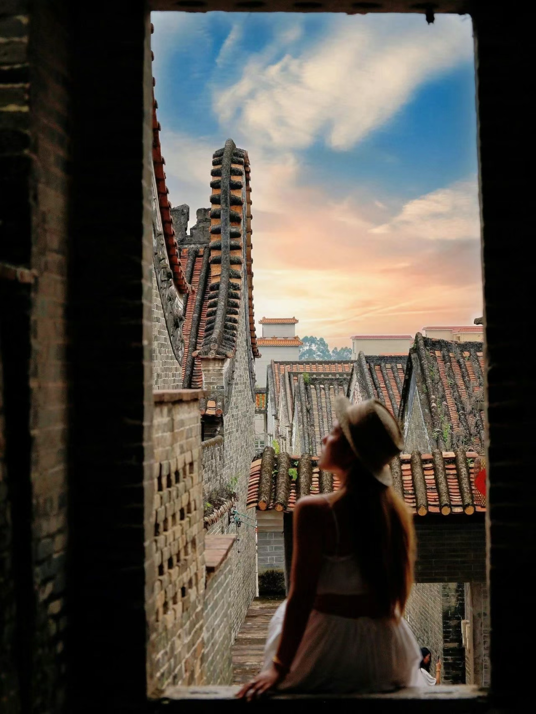 全网爆火的俯视全景机位,层叠镬耳墙像波浪。日落时分用长焦拍光影切割的古村轮廓,文笔山半山腰,有一个很大榕树可以打卡拍照。